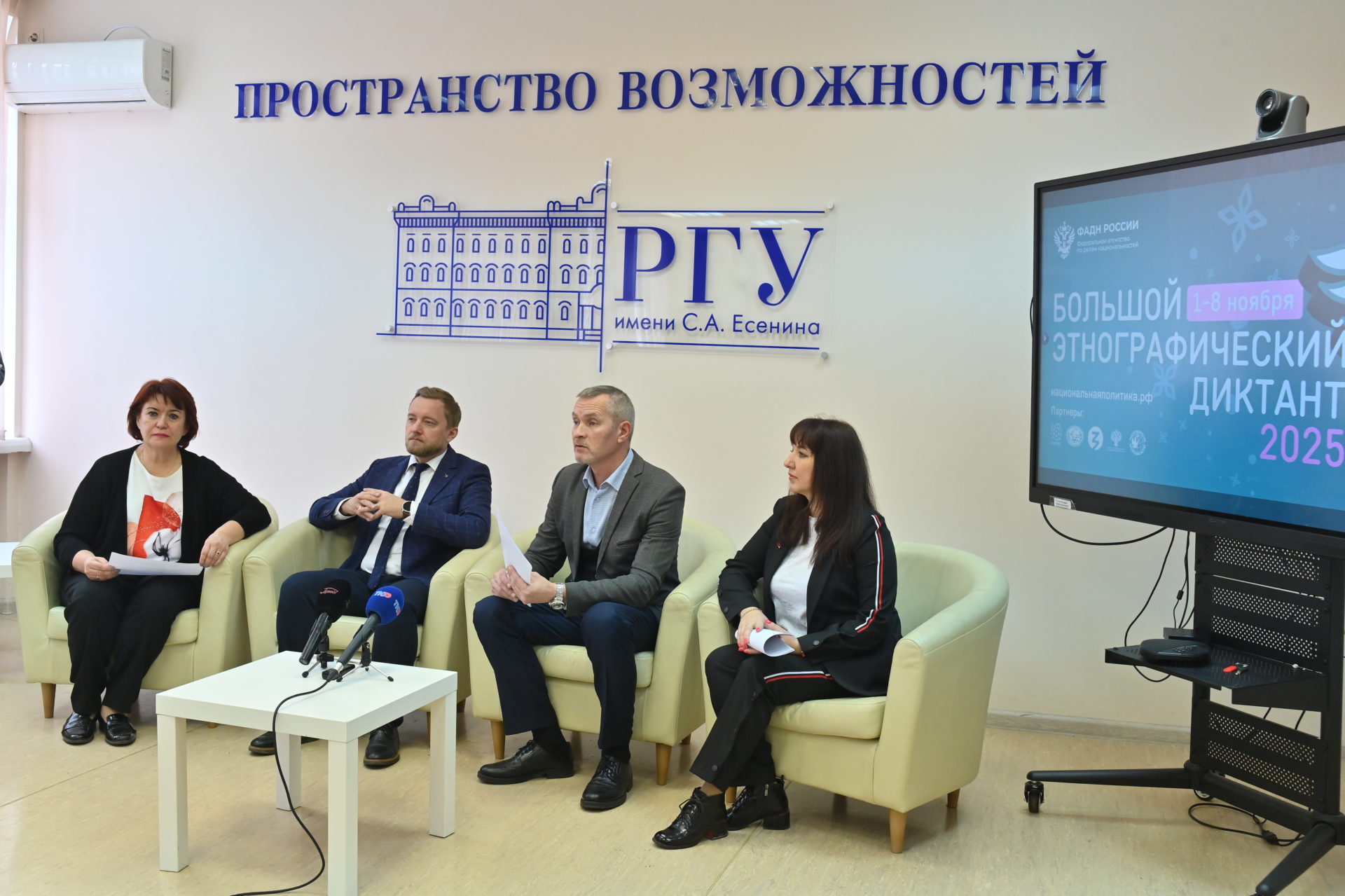 Х Всероссийская просветительская акция «Большой этнографический диктант» будет проведена с 1 по 8 ноября. Об этом на пресс-конференции рассказали ректор РГУ имени С.А.Есенина Дмитрий Боков; координатор акции «Большой этнографический диктант», консультант отдела по работе с политическими партиями, национальными, религиозными объединениями и казачеством министерства территориальной политики Рязанской области Игорь Митрофанов; координатор уникальной площадки в РГУ имени С.А.Есенина Елена Кирьянова; председатель национально-культурной автономии татар города Рязани Фарида Сабирова.