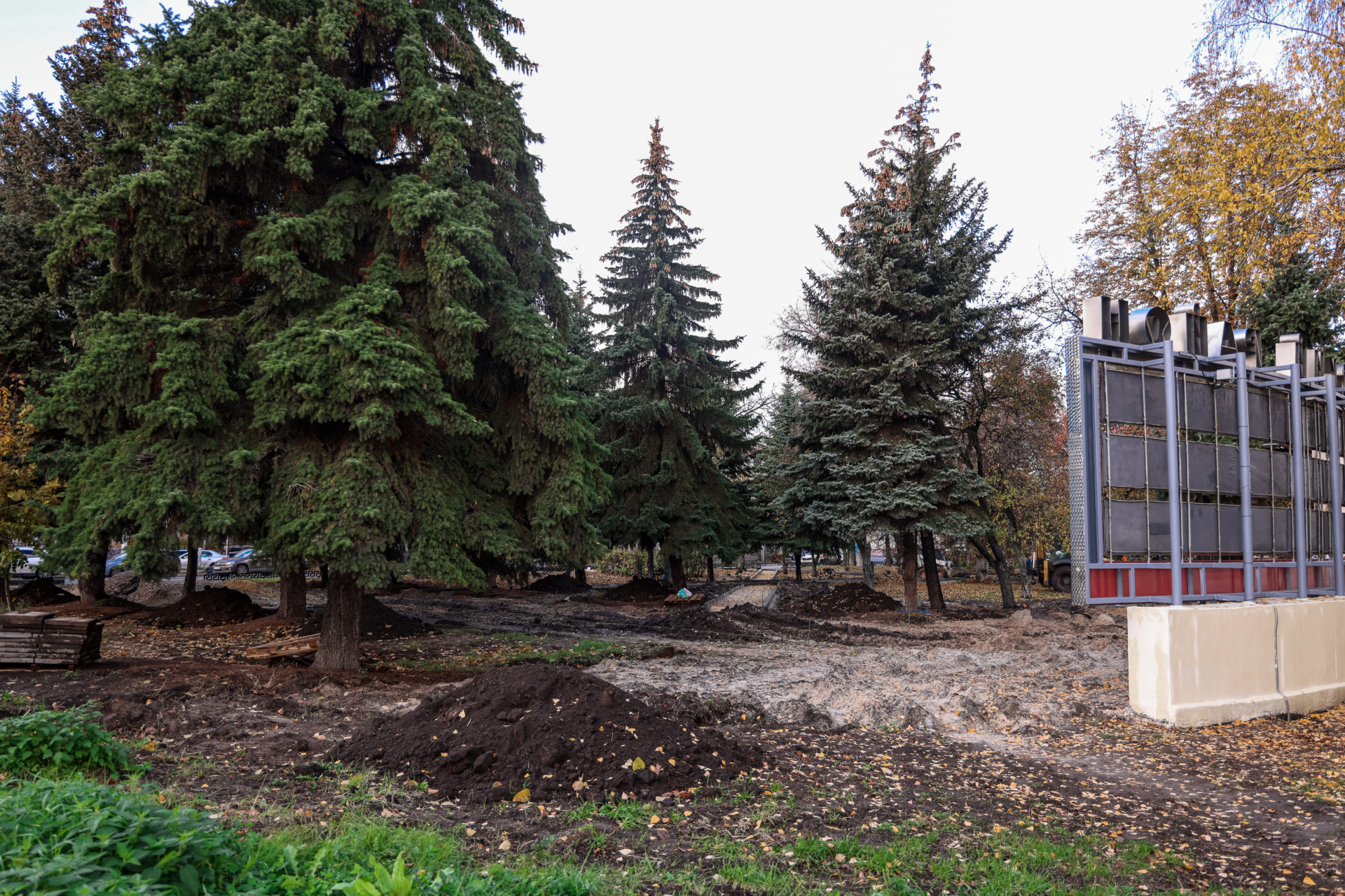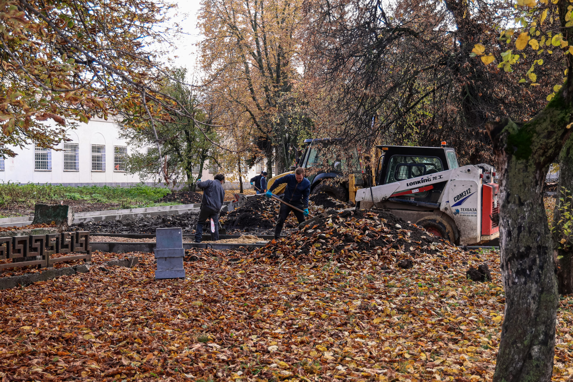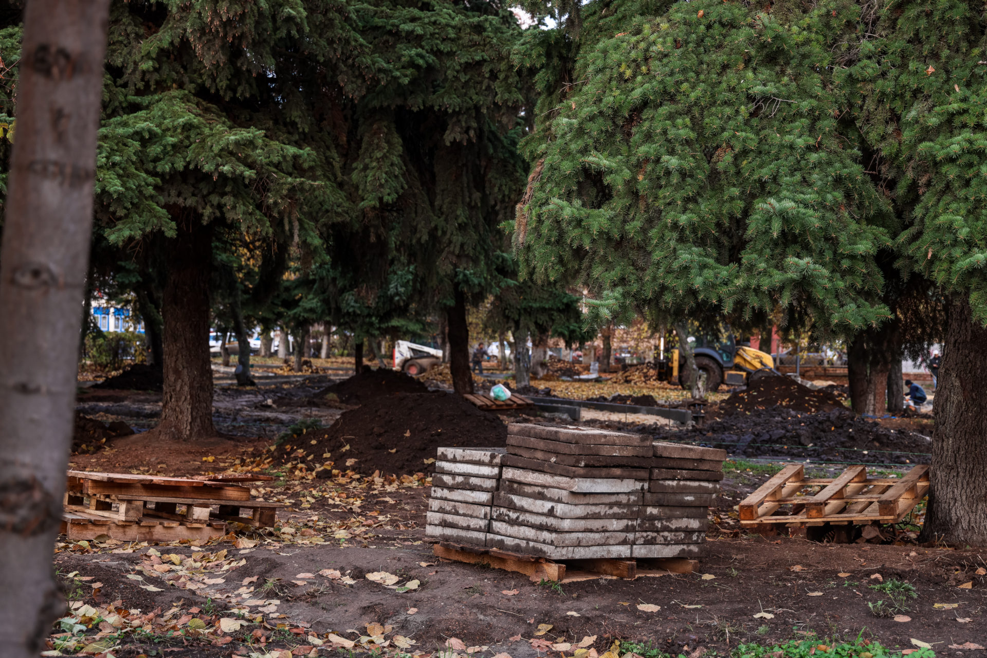 Недавно в сквере началось благоустройство. Работают люди и техника. Разобрано старое асфальтобетонное покрытие, демонтирована плитка. Идут земельные работы, уже вырисовываются четкие контуры будущих пешеходных дорожек и зеленых зон. Также здесь должны установить новые скамейки и урны, сделать наружное освещение.