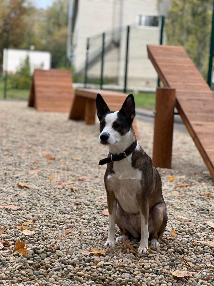 Площадка оборудована спортивными снарядами для дрессировки и выгула собак. На территории размещено современное галечное покрытие, которое обеспечит хороший дренаж и позволит избежать застоя воды и грязи под ногами в межсезонье. Кроме того, на территории установлены навесы от дождя и скамейки для владельцев животных.