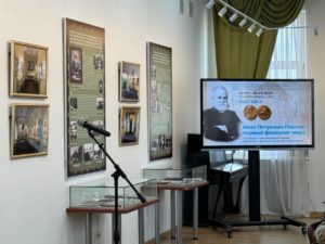 Экспозиция приурочена к 175-летию со дня рождения академика И.П.Павлова и 120-летию со дня получения им Нобелевской премии. Она рассказывает о жизни и деятельности ученого. Кроме того, в ней представлены прижизненные издания трудов И.П.Павлова, рукописные документы и фотографии, медицинские инструменты.