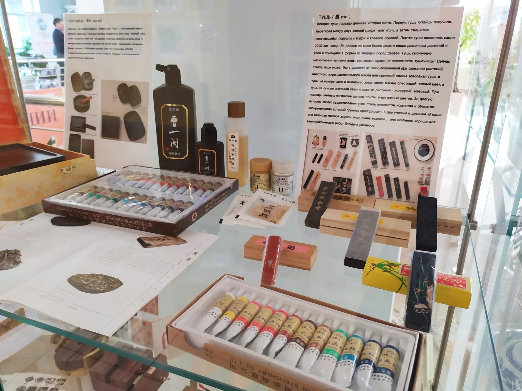 Дополняют выставку пособия по китайской живописи и предметы, необходимые художникам – плитки туши, кисти и другие принадлежности.