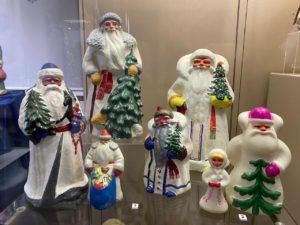 Экспозиция не ограничивается музейными фондами. Особый шарм ей придают частная коллекция Дедов Морозов и Снегурочек от Владимира Мильцина и сказочные игрушки художницы Елены Бабкиной, добавляющие всей выставке нотку авторского волшебства.
