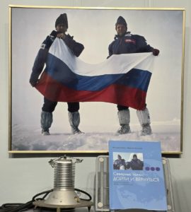 На выставке «До макушки планеты и обратно. Исследованию Арктики посвящается…» представлены материалы и вещи из нескольких арктических экспедиций: элементы экипировки, ледоступы, документы и фотографии, переданные участниками героических путешествий и хранящиеся в фондах музея.