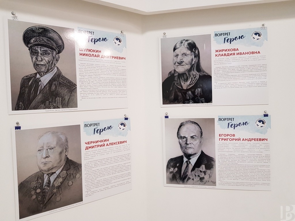 – К сожалению, не все ветераны, в силу возраста, могли позировать художникам, поэтому некоторые портреты писались с фотографий, – комментирует куратор выставки Екатерина Жирихова. Кстати, среди рисунков есть и её бабушка – Жирихова Клавдия Ивановна. Она не участвовала в боевых действиях, в 41-м году ей только исполнилось 12 лет. Двое её старших братьев были призваны на фронт и погибли в первые дни войны. А она вместе с другими детьми и подростками, оставшимися в тылу, принимала участие в строительстве оборонительных сооружений, работала в колхозе, помогала собирать урожай и ухаживать за скотом. Удостоена звания Ветерана труда. Она, как почётный труженик тыла, находится среди артиллеристов, пехотинцев и разведчиков, которые приближали день за днём нашу великую Победу. Оригиналы портретов, разумеется, были подарены ветеранам. На выставке представлены их фото, дополненные рассказом о подвигах в годы войны.