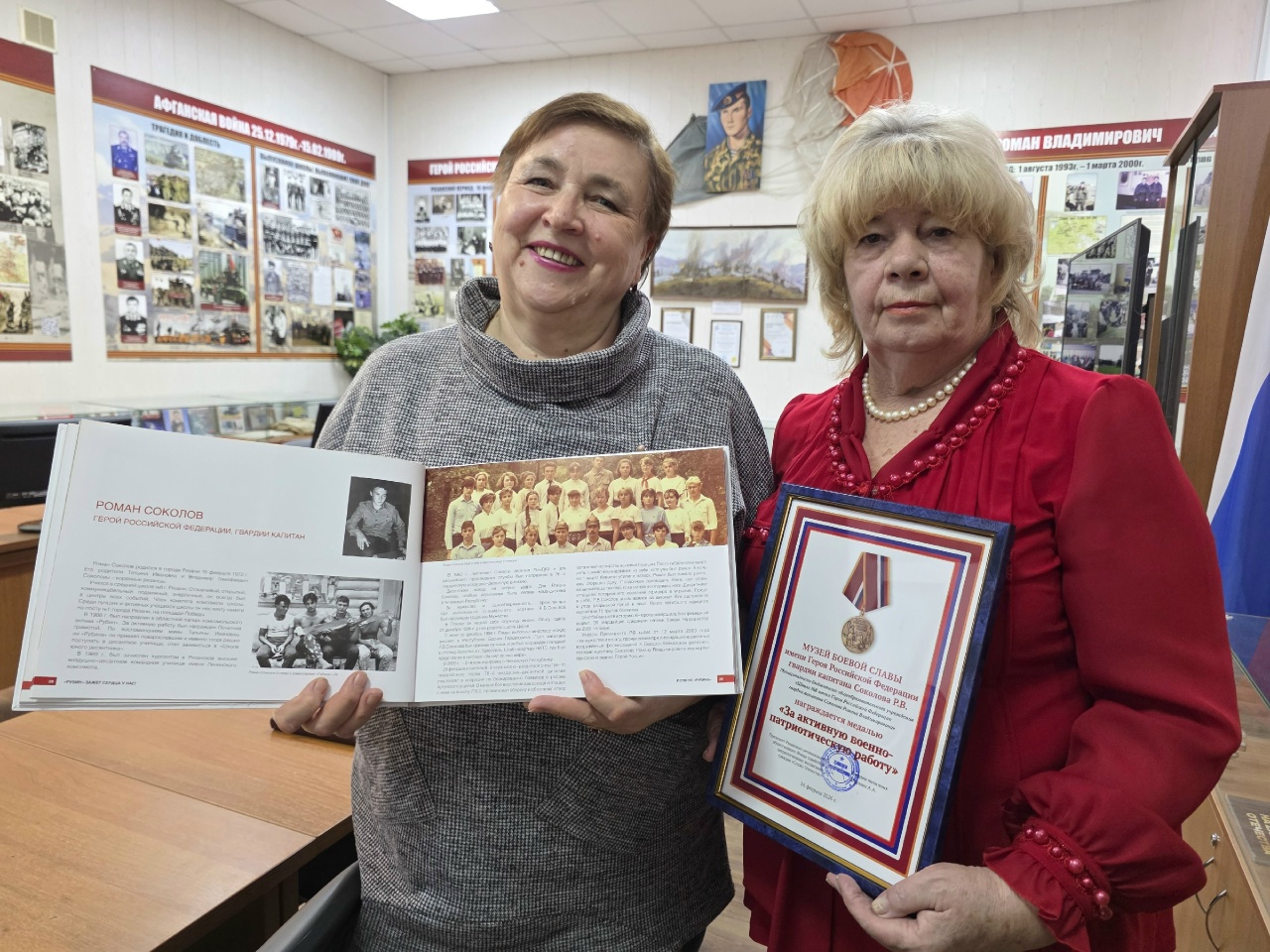 вручили руководителю музея Валентине Кондрашовой медаль «За активную военно-патриотическую работу». Начальник управления воспитания и дополнительного образования министерства образования Рязанской области Надежда Куликова подарила музею книгу «Рубин» зажег сердца у нас» о лагере актива старшеклассников, который, по её словам, открыл Роману Соколову дорогу в Рязанское воздушно-десантное училище.