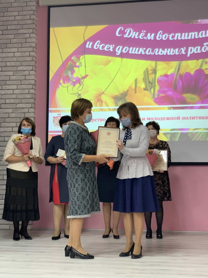 Елена Митина поблагодарила воспитателей за их труд и вручила грамоты от общероссийского профсоюза работников образования.