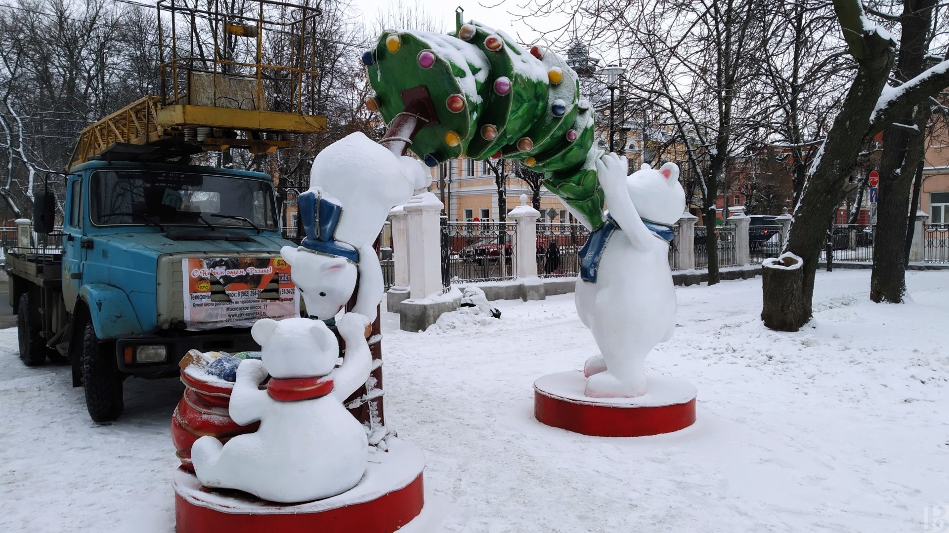 В преддверии новогодних праздников в Верхнем городском парке уже были установлены трехметровые фигуры Деда Мороза и Снегурочки, двух медведей, держащих елочную арку, снеговиков-музыкантов, светящийся фонтан, сани новогоднего волшебника, мешок и большой подарок с бантом, а также 25 снежинок.