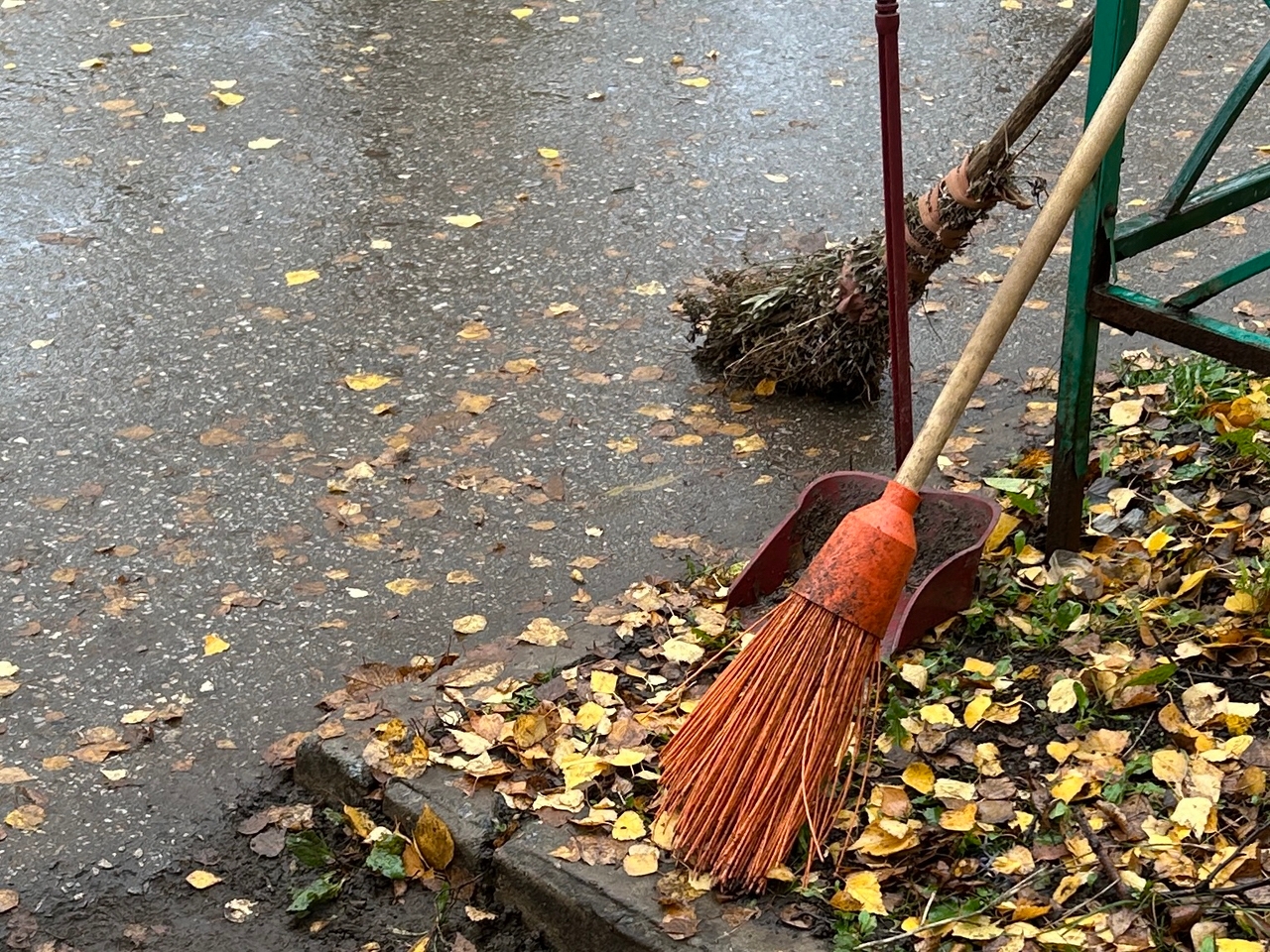 Уборка продолжается днем. Сотрудники собирают случайный мусор, очищают урны. Спецтехника работает на дорогах и тротуарах. Запланирован ямочный ремонт, электрики участка наружного освещения обслуживают городские сети.