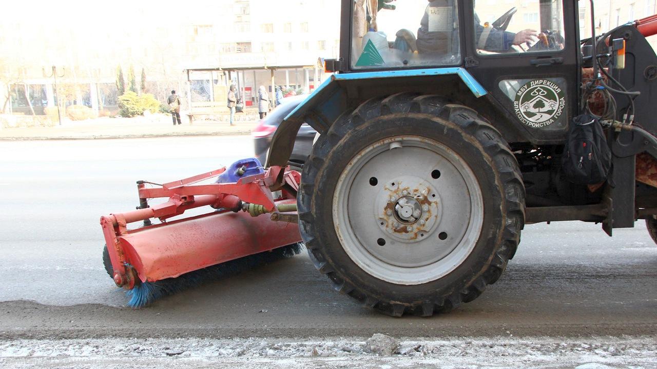 Бригады мехуборки очищали от снега и наледи Первомайский проспект.
