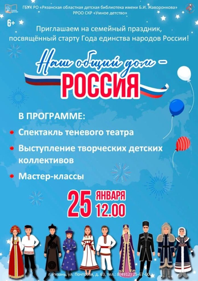 В Рязанской областной детской библиотеке им. Б.И. Жаворонкова 25 января в рамках мероприятий, посвященных Году единства народов России, состоится праздник «Наш общий дом – Россия».