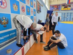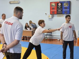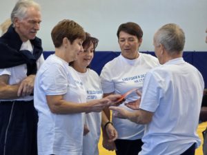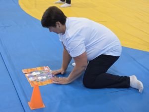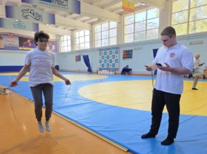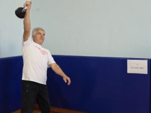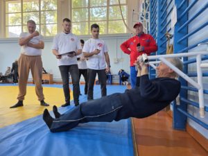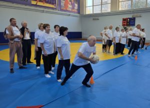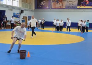 Далее ветераны спорта выполняли упражнения комплекса ГТО – поднимали гирю на определенное количество раз, отжимались от гимнастической скамейки в положении лёжа, подтягивались на низкой перекладине из виса лёжа, выполняли наклон из положения стоя с прямыми ногами, прыгали через скакалку, метали дротик в цель и радовались своим успехам, переживая друг за друга. Илья Андреевич Крючков лично консультировал участников, объяснял, как правильно поднимать гирю.