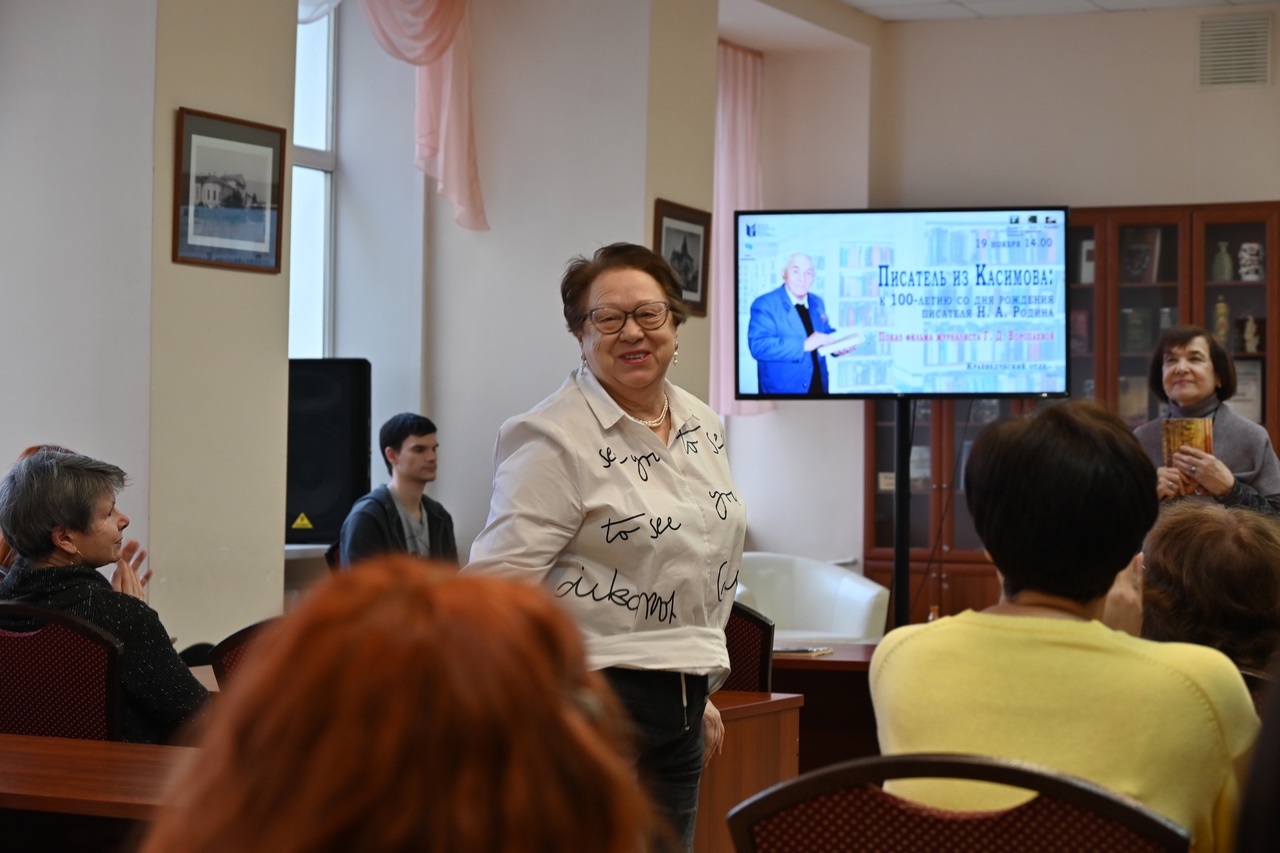 К столетию известного писателя, лауреата Всероссийской премии «Малая родина» Николая Александровича Родина в отделе краеведения библиотеки имени Горького развернута выставка его книг. Но гостям вечера представилась и другая возможность: увидеть писателя на большом экране. Журналист Галина Воропаева показала свой телеочерк «Писатель из Касимова», снятый в 2002 году. В беседе с журналистом Николай Родин вспоминает Касимов своей молодости, рассуждает о сложностях времени, о драматичных эпизодах судьбы, в том числе об исключении из Союза писателей Александра Солженицына. Вспоминает родственников, которые безвинно пострадали в сталинскую эпоху, подверглись репрессиям.