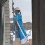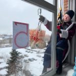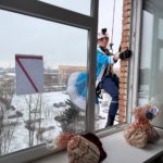 Однако главный сюрприз ждал детей впереди. После викторины с крыши медицинского учреждения, используя альпинистское снаряжение, спустились волонтеры аварийно-спасательного центра «Салюс» в костюмах Дедов Морозов и Снегурочек. Они передали детям в окно мешки с большими сладкими подарками.