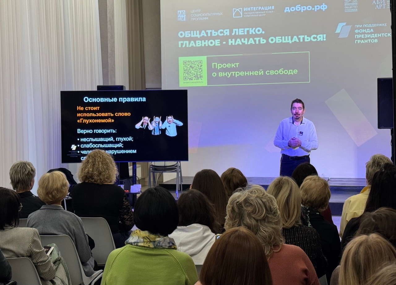 Встреча, посвященная вопросам общения с людьми с разными формами инвалидности, проходит во Дворце культуры и искусства. Проект «Общаться легко. Главное – начать общаться!» реализуется при поддержке Фонда президентских грантов. Семинар является частью социокультурного проекта «Люди ИН».
