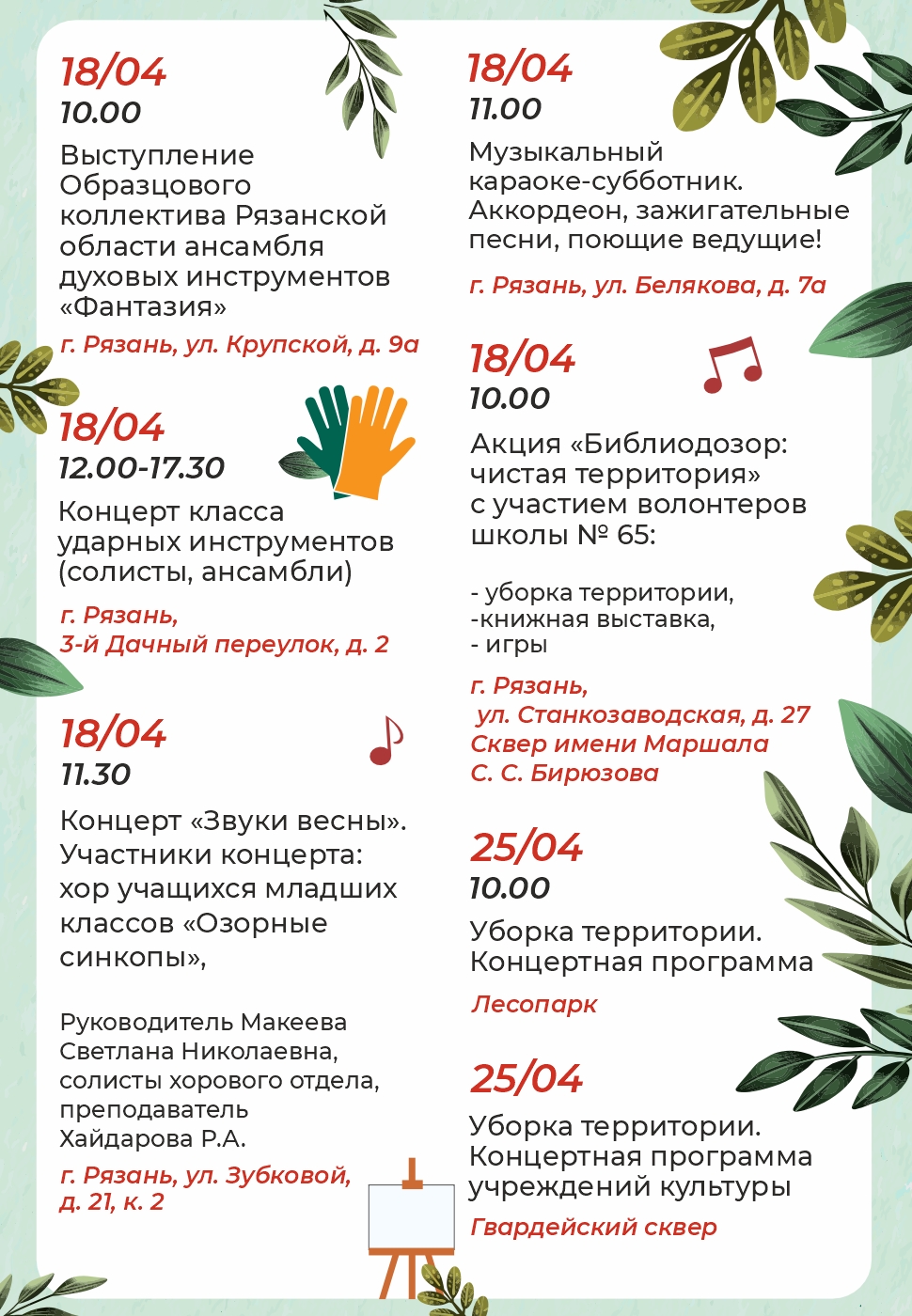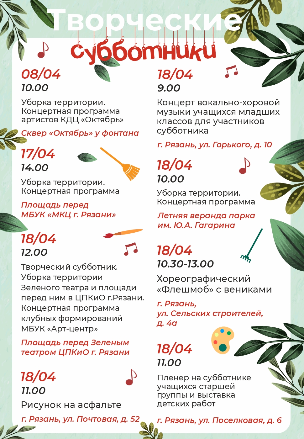 В рамках субботника на разных городских территориях состоятся флешмобы и концертные программы, организованные рязанскими учреждениями культуры.