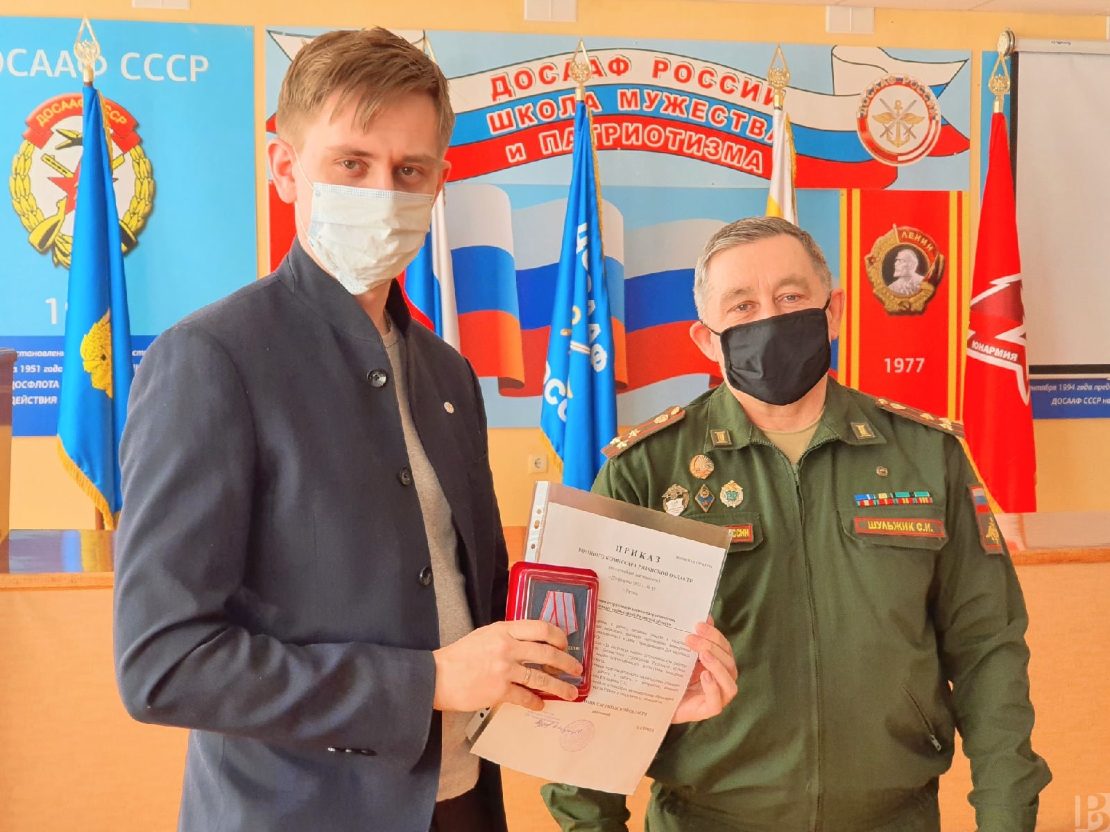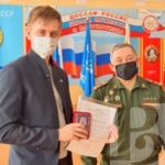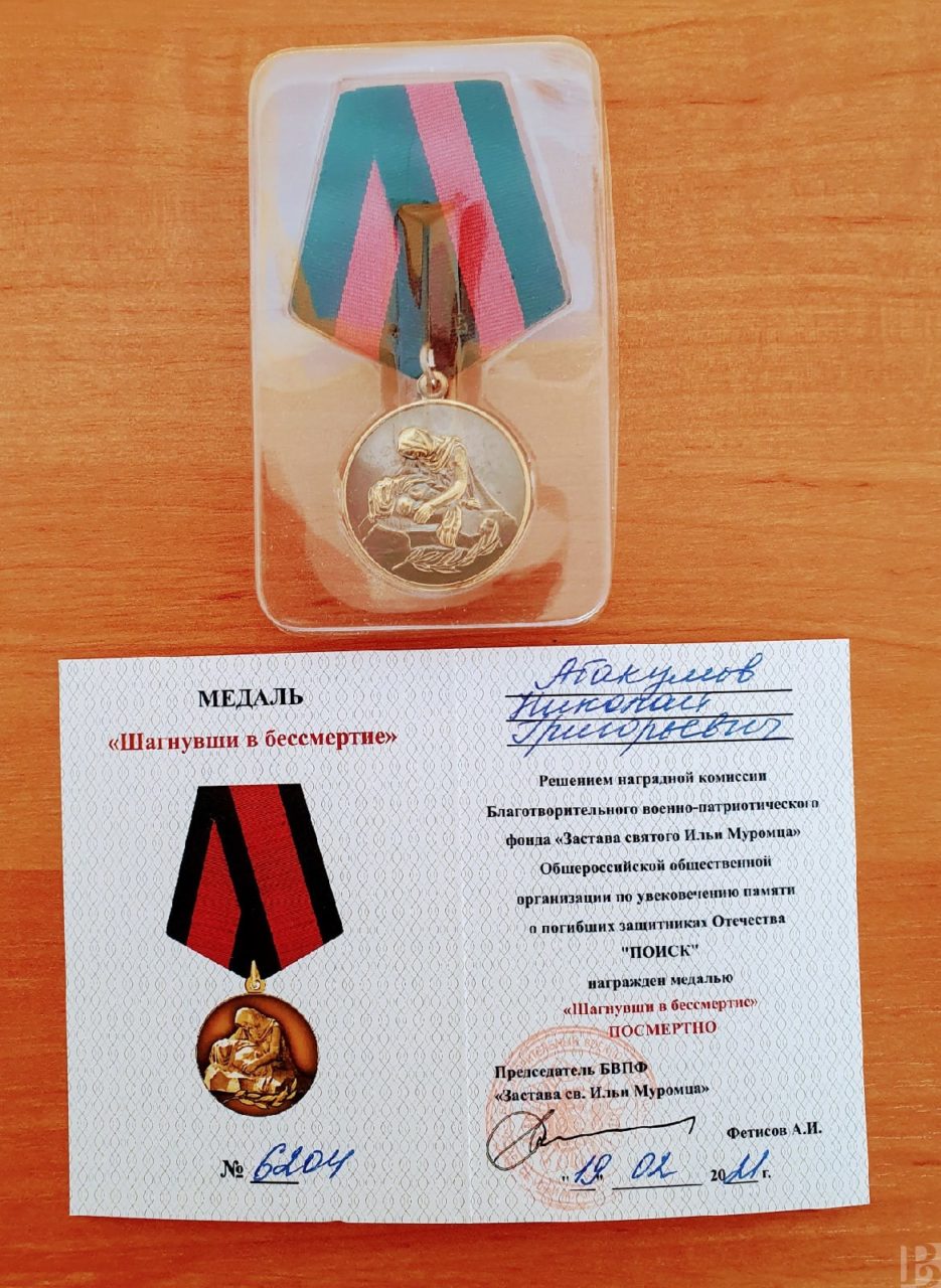 Никите Кузьмину и Николаю Стрелкову за активную работу по патриотическому воспитанию молодежи начальник отдела военкомата Святослав Шульжик вручил награды. Медаль «Шагнувшие в бессмертие» общероссийского общественного движения «Поисковое движение России» вручена родным красноармейца Николая Григорьевича Абакумова.