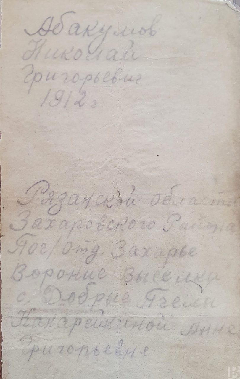 Николай Григорьевич Абакумов родился в 1912 году. В начале войны был призван на фронт. Погиб в сентябре 1942 года на Синявинских высотах, в боях за Ленинград. В 2003 году поисковый отряд из Челябинска «Булат» вел в тех местах раскопки («Вахта Памяти») и нашел этот медальон. С тех пор и до января 2021 года документ хранился в музее истории Челябинска. Местные поисковики случайно обратили на него внимание, уточнили информацию по бойцу и связались с председателем Рязанского регионального отделения общероссийского общественного движения «Поисковое движение России» Николаем Стрелковым. Николай Николаевич разыскал племянницу Николая Абакумова – Зинаиду Васильевну Тимакову.