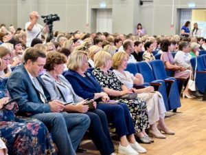 Поприветствовала и наградила работников системы образования заместитель председателя правительства Рязанской области Наталья Суворова: «Сегодня в зале те, кто дают фундамент нашему будущему. По поручению губернатора Рязанской области Павла Малкова разрешите выразить вам благодарность! В этом году мы дали старт строительству шести новых школ и детских садов. В рамках программы «Развитие сельских территорий» в селе Успенском открываются новые объекты и благодаря этому увеличивается рождаемость в области. Мы будем развивать дополнительное образование и откроем новый методический центр «Гелиос». С сентября нужно продолжать профориентационную работу».