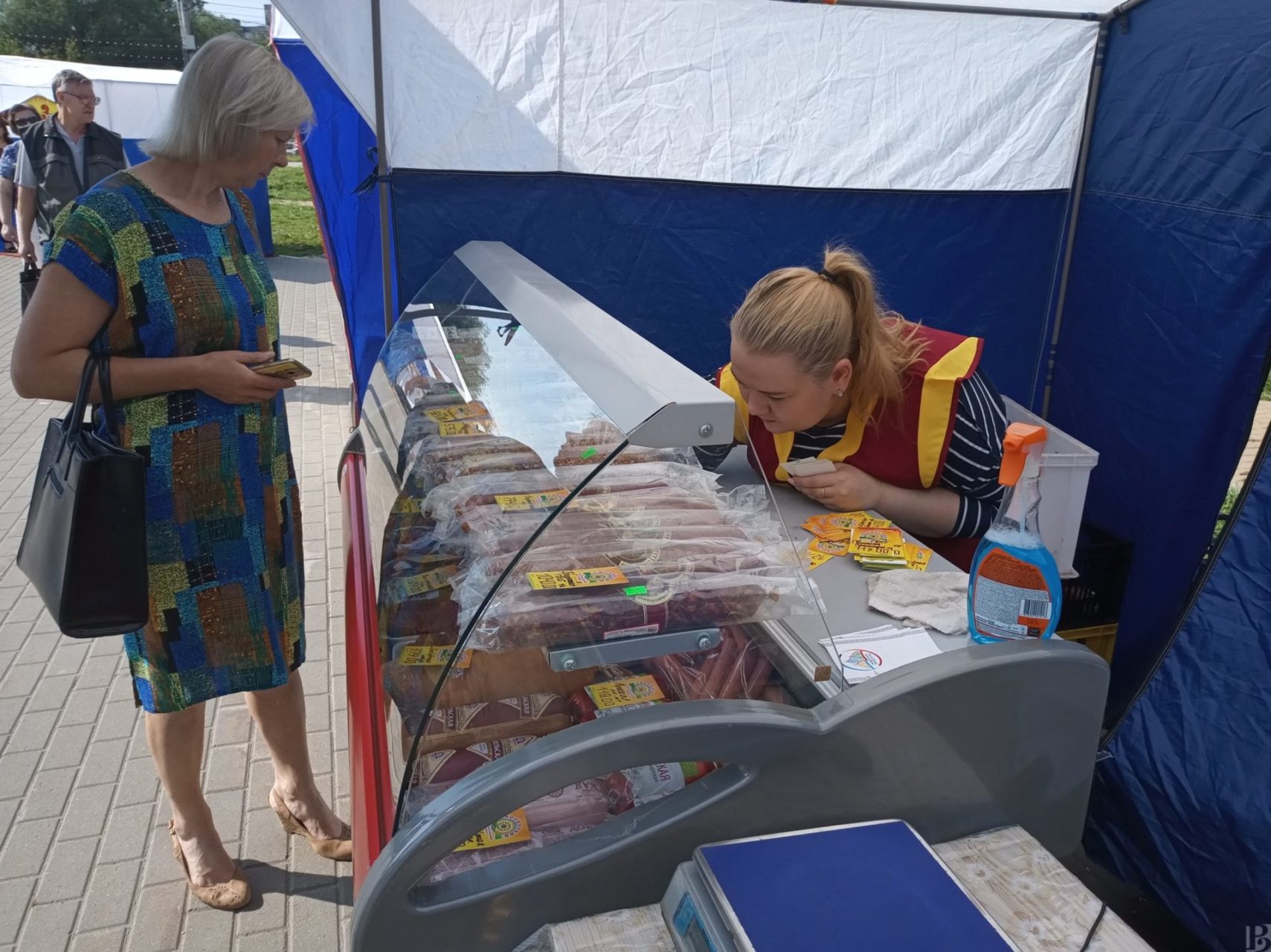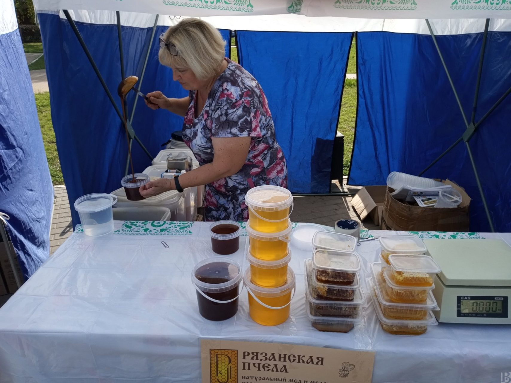 На улице Советской армии раскинулся палаточный базар. Здесь только Рязанские продукты, причем помеченные соответствующим знаком. Он присваивается не только за высокое качество, но и за участие производителей в социально ориентированных акциях, а также в активном продвижении товаров за пределами области.