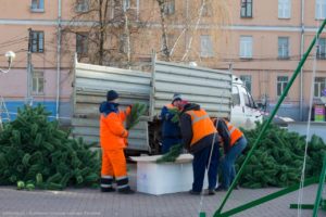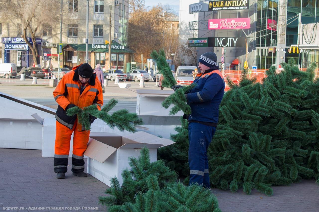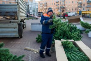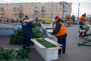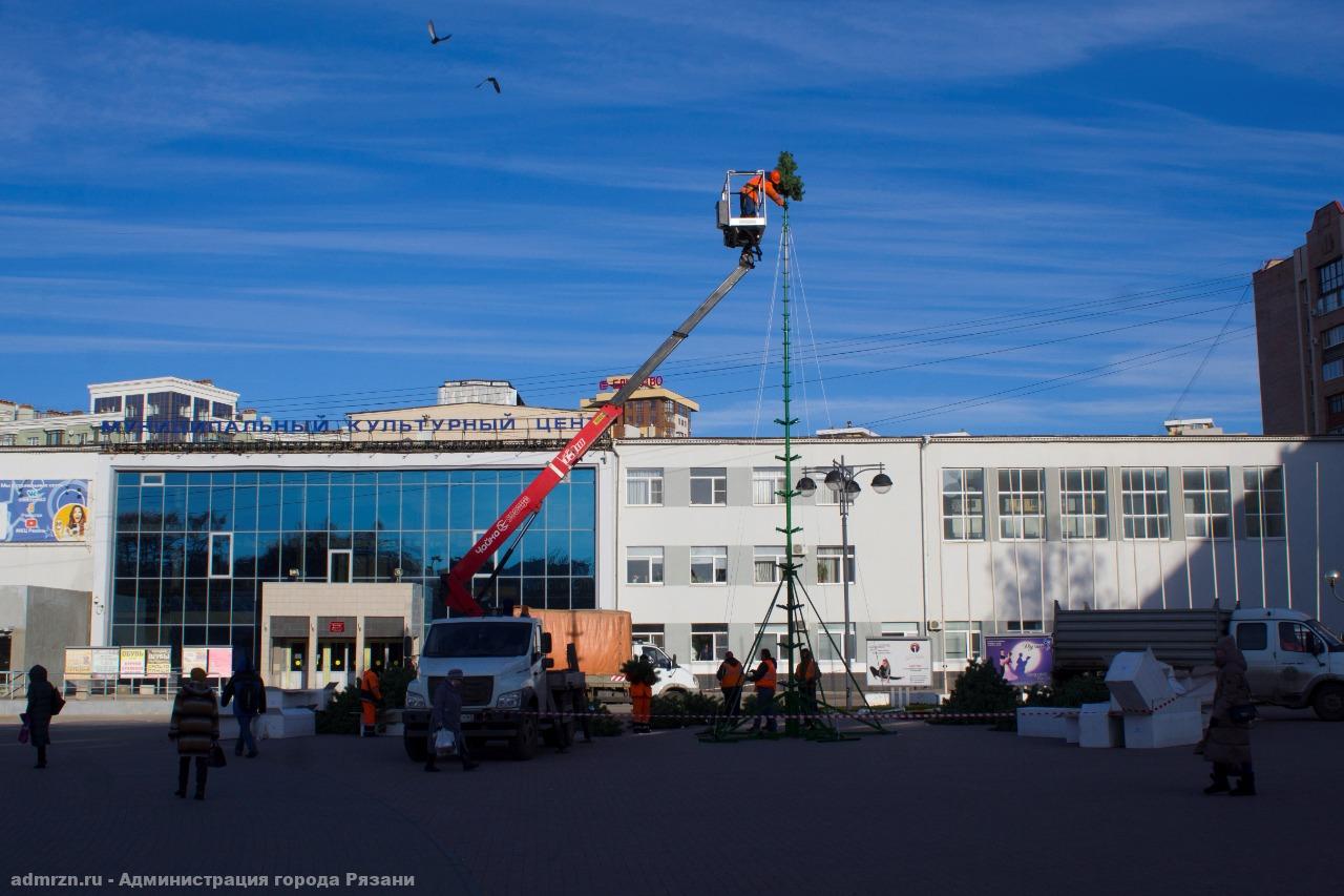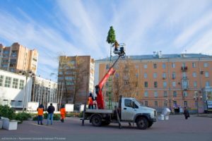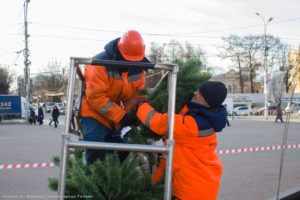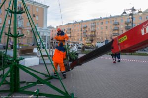 Утром 23 ноября работники Дирекции благоустройства начали работы у Муниципального культурного центра. Ель здесь устанавливается ежегодно, ее высота 12 метров. В первой половине дня был закреплен ствол и подготовлены ветки, которые крепятся вручную. В работе задействована 15-метровая вышка и бригада сотрудников.