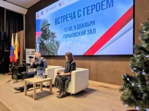 После краткого знакомства с героем модератор Марина Табина предложила школьникам подготовить вопросы и пригласила на сцену участницу встречи – директора Рязанской областной универсальной научной библиотеки имени Горького, председателя Общественной палаты Рязанской области Наталью Гришину, которая вспомнила о своих погибших на войне родственниках.