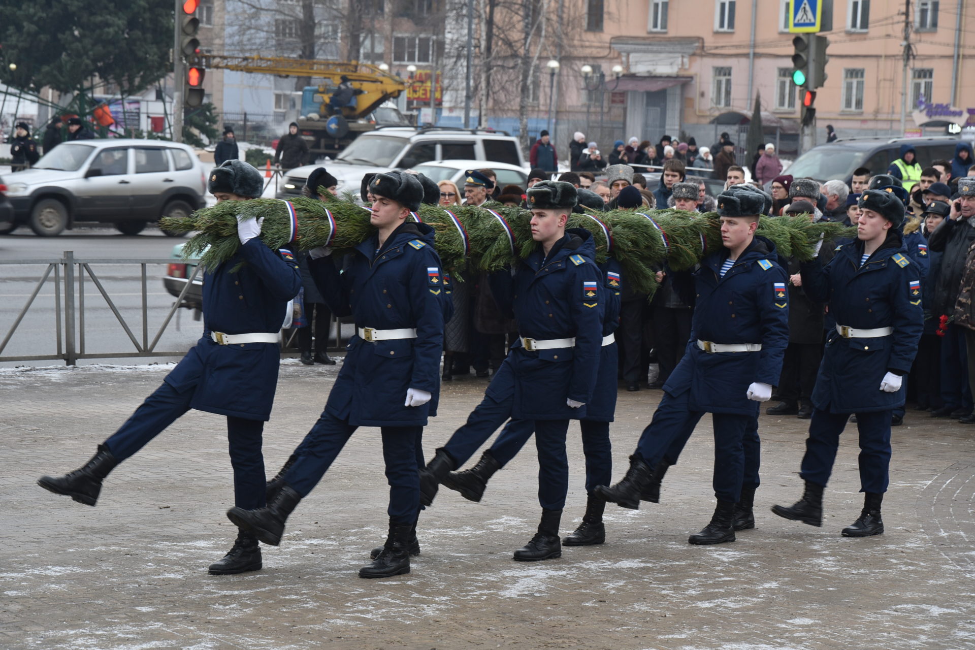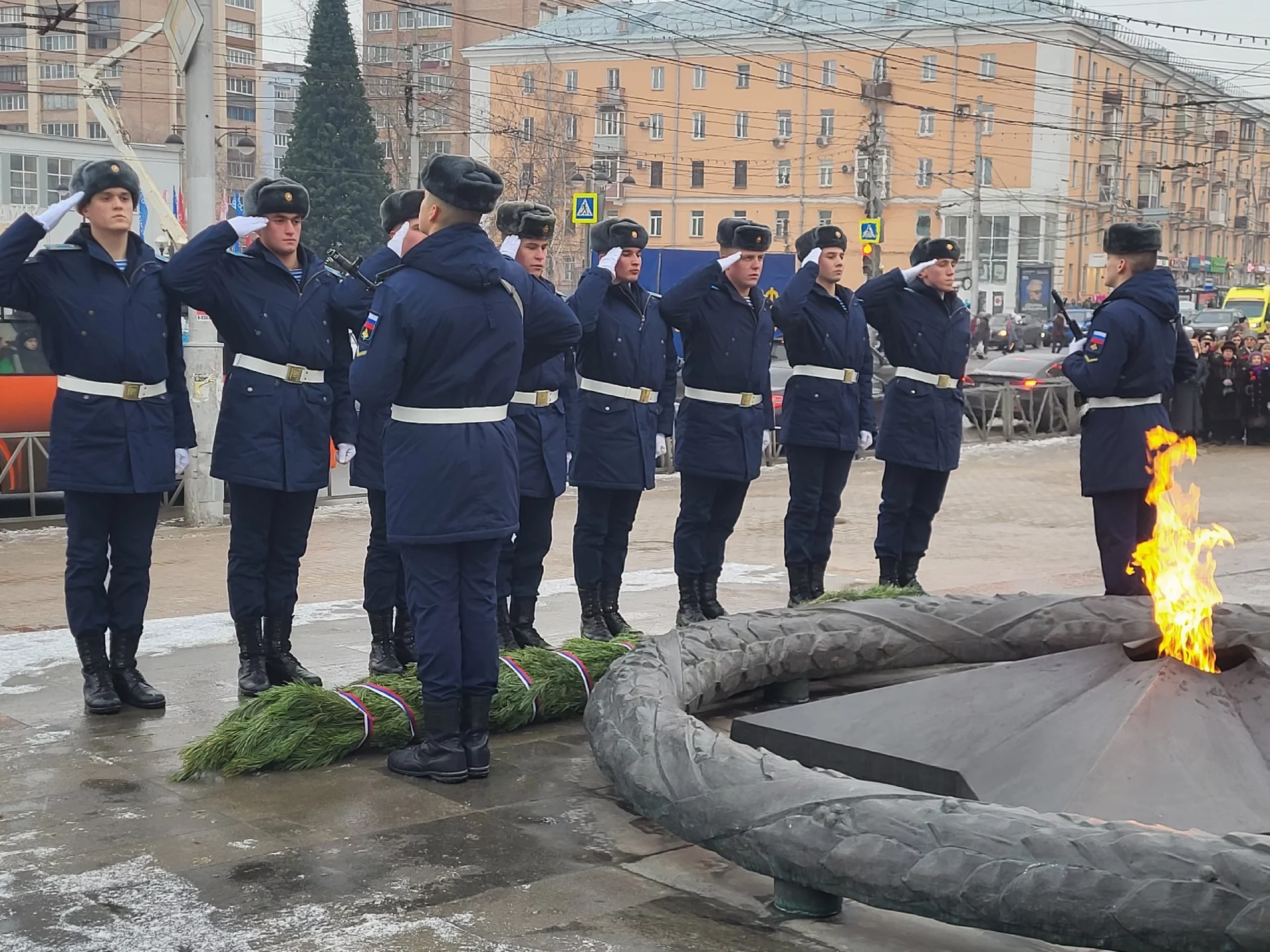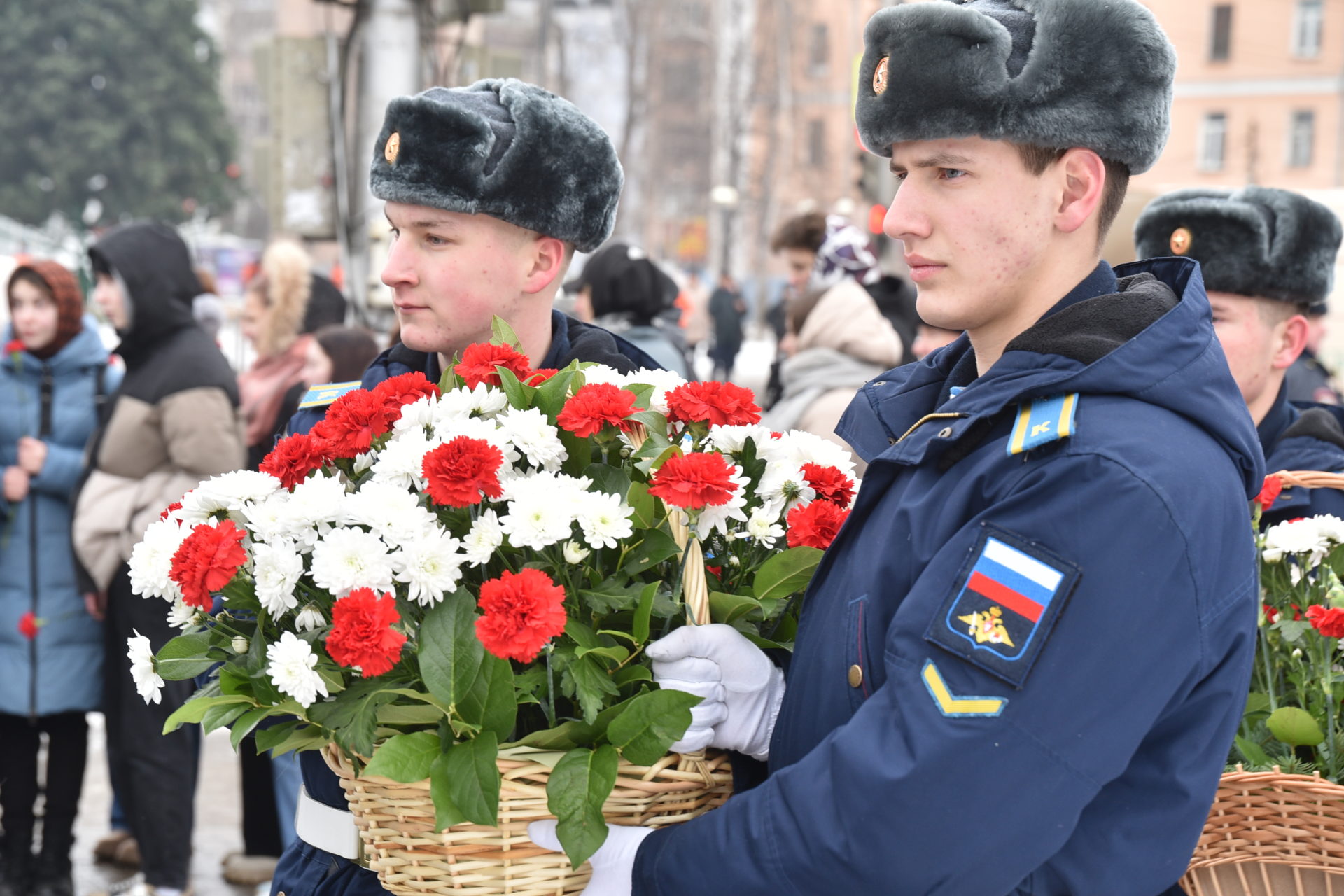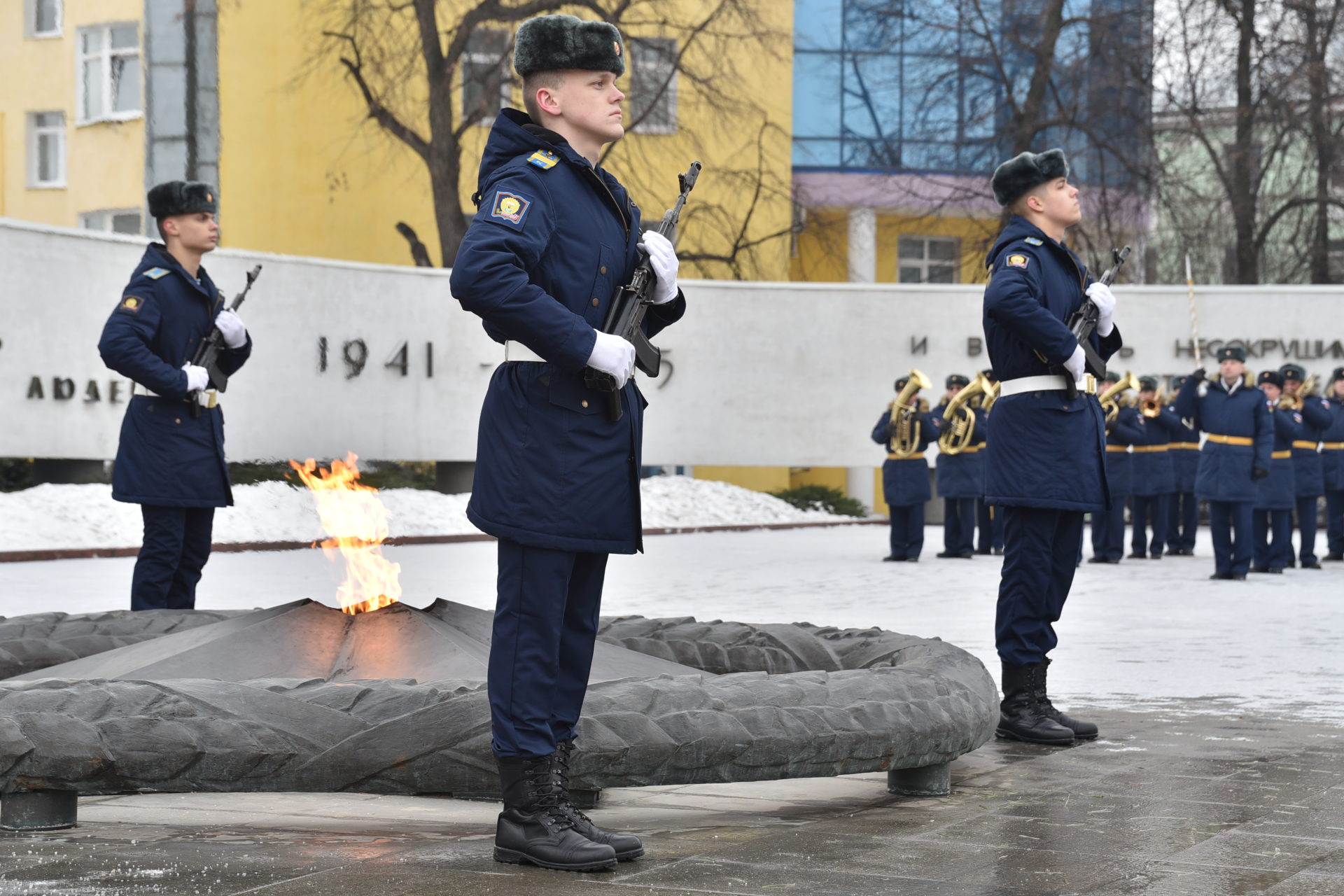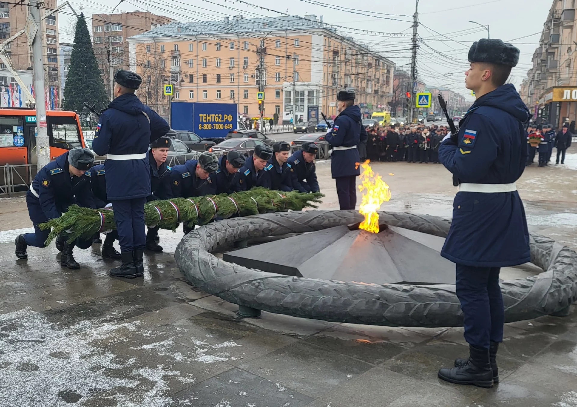 Торжественная церемония началась с минуты молчания. Курсанты Рязанского гвардейского высшего воздушно-десантного командного училища имени генерала армии В.Ф. Маргелова возложили к мемориалу “Монумент победы” гирлянду воинской славы.