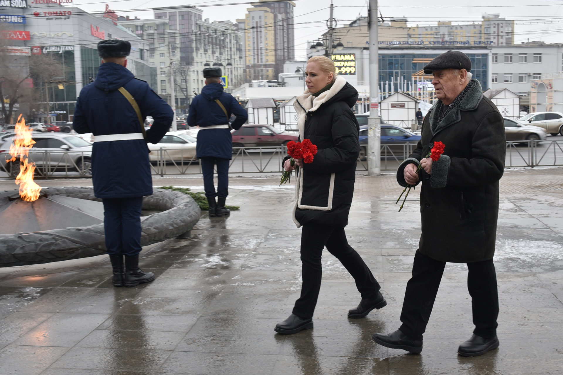 Цветы к монументу Победы возложилип первый заместитель председателя правительства Анна Рослякова и участник Великой Отечественной войны Леонид Иванович Окрут.
