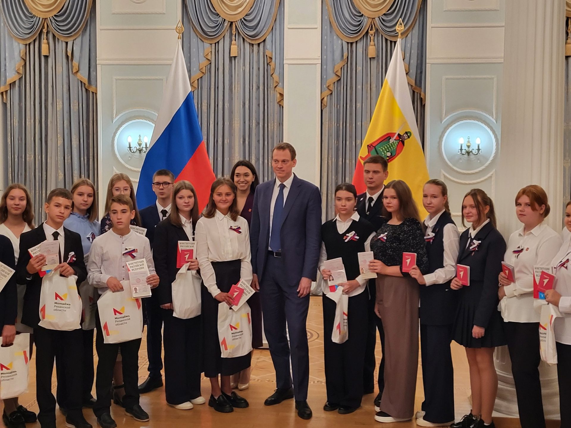 Паспорта школьникам вручали губернатор Павел Малков, начальник управления по вопросам миграции УМВД России по Рязанский области подполковник полиции Максим Горожанов и председатель Совета регионального отделения Движения Первых Татьяна Косачёва.