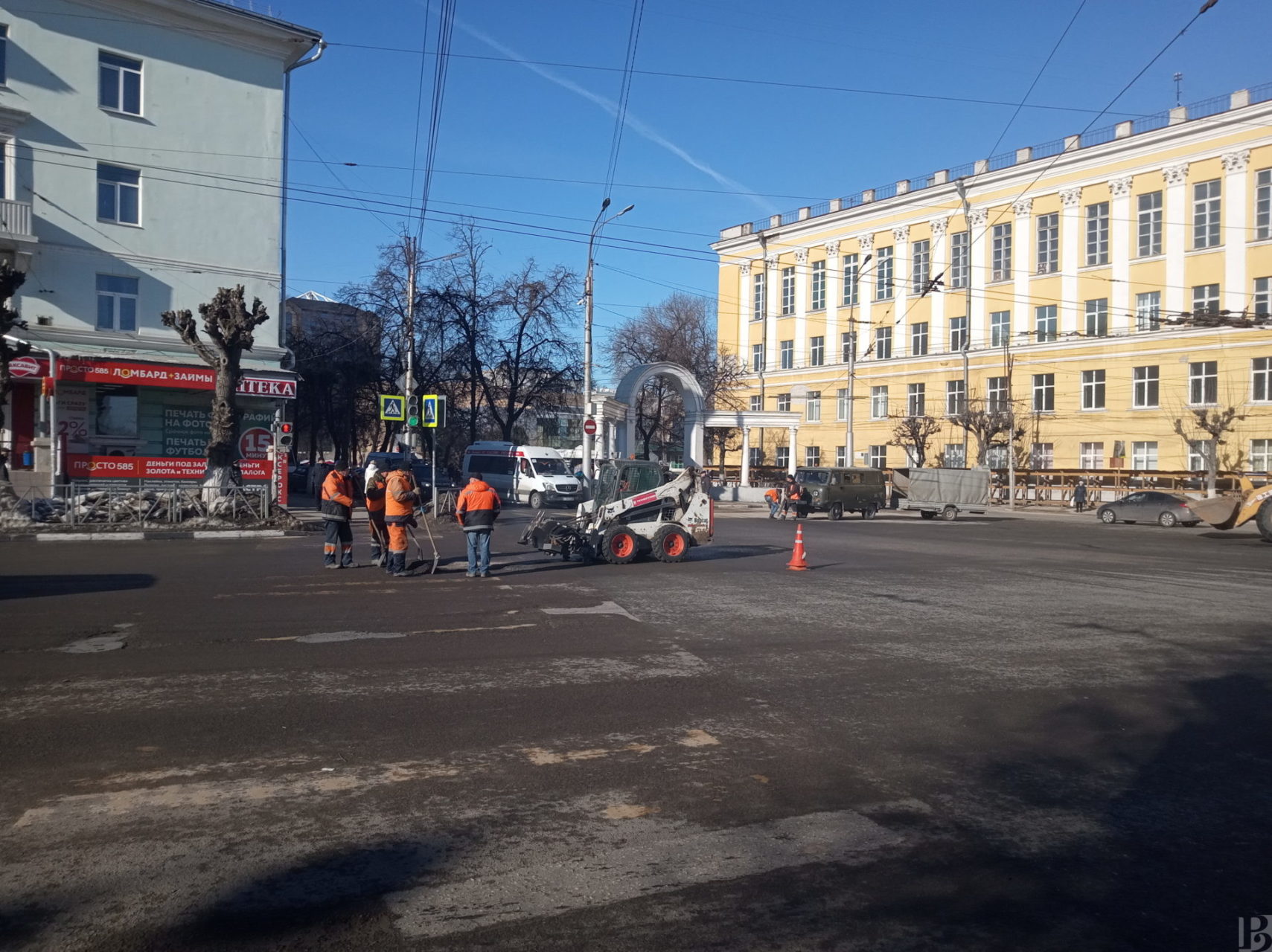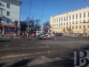 Работы начались ещё вчера. От перекрестка ул. Циолковского с ул. Яблочкова и до Театральной площади все ямы на проезжей части ликвидировала стандартная полная бригада рабочих с тремя единицами техники. Каждая яма на асфальте обрабатывалась фрезой, а затем ликвидировалась при помощи горячего асфальтобетона марки Б-2. Как пояснил сотрудник подрядной организации, скорость работ зависит от того, несколько быстро удается запустить технологические процессы на заводе по производству дорожной смеси, а на это влияют температурные условия. Работы проводятся по запросу администрации областного центра.
