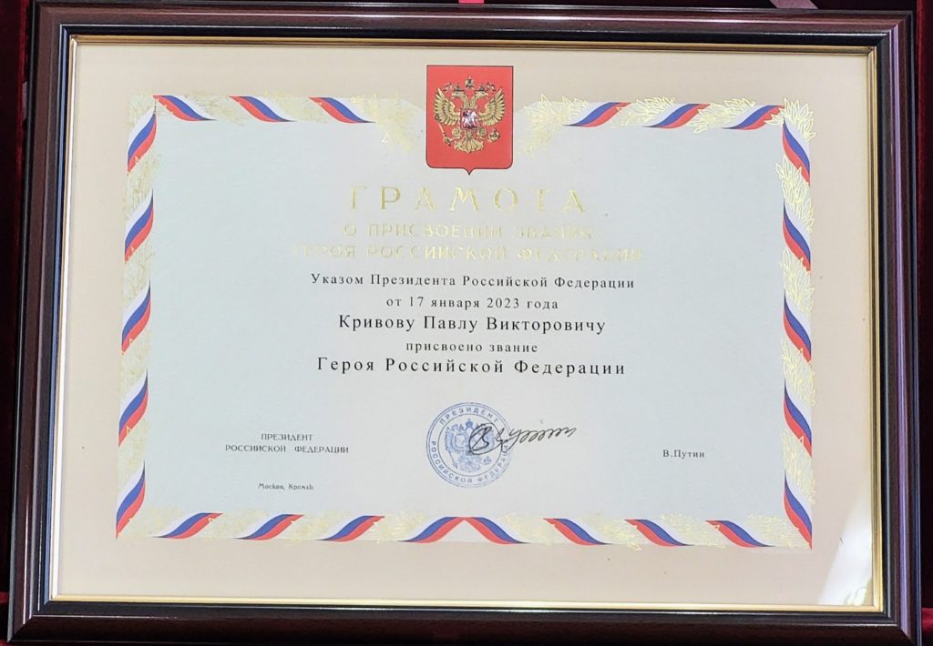 Золотую Звезду Героя России и грамоту о присвоении высокого почётного звания губернатор Павел Малков вручил семье Павла Викторовича Кривова, который стал седьмым Героем России в прославленном гвардейском полку.