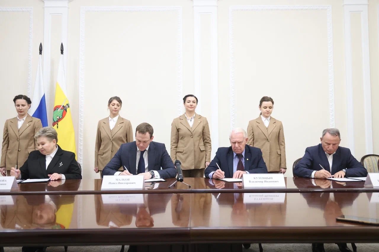 Между правительством Рязанской области, профсоюзами и работодателями региона подписано соглашение на 2025-2027 годы. Подписи на документе поставили губернатор Павел Малков, председатель областного союза организаций профсоюзов Инна Калашникова, председатель правления Рязанской Ассоциации экономического сотрудничества предприятий Владимир Кутенцын и председатель правления регионального объединения работодателей «Агропромышленный союз» Георгий Свид.