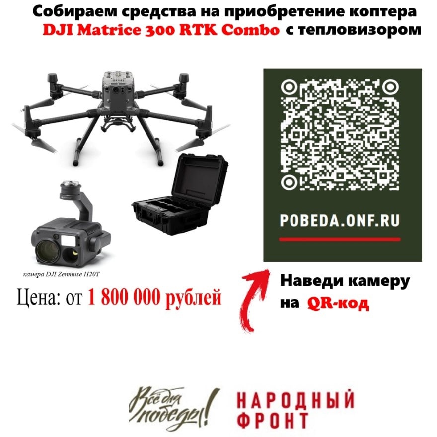Как сообщает региональное отделение ОНФ, жители Рязанской области за 12 дней перечислили в копилку регионального сбора проекта «Все для победы» 1 млн. 154 тыс. рублей. На собранные средства планируется приобрести большой квадрокоптер DJI Matrice 300 RTK Combo с подвесом с тепловизионной камерой DJI Zenmuse H20T стоимостью более 1 800 000 рублей.