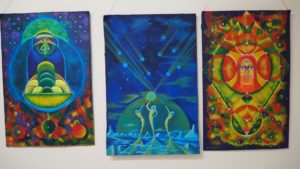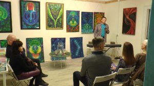 Творчество художника с полным правом можно отнести к «русскому космизму». На полотнах – изображения причудливых миров, галактик, вписанных в разные геометрические фигуры, создающие образам многослойность. Девиз Владимира Витальевича – «Черпайте вдохновение у природы».» Бабушка Владимира была известной в округе знахаркой, от нее Владимиру передалась особая чуткость и восприимчивость к людям. «Радость и блаженство сопровождают человека только тогда, когда он осознает себя и свою связь с высокими планами бытия», – говорит художник-любитель. Метафизику полотен дополни ряд творческих встреч с поэтами и музыкантами в экспозиционном зале. Так, в один из вечеров на фоне картин с лекцией «Ящик Пандоры» выступил композитор и продюсер Геннадий Филин. Музыкант-импровизатор исполнил пьесу под названием «Соль». «Если вы хотите жить без болезней и быть всегда бодрым, умейте прощать», – обратился к публике Геннадий. – Осознанность и доброта – вот двери в счастье, – сказал композитор, поведав о своем духовном пути и преодолении собственных недостатков
