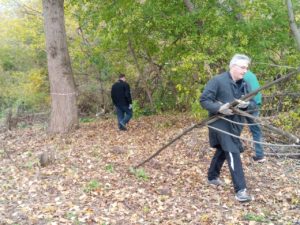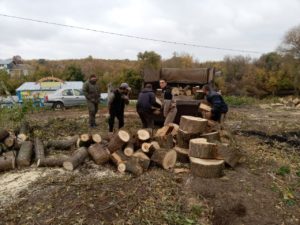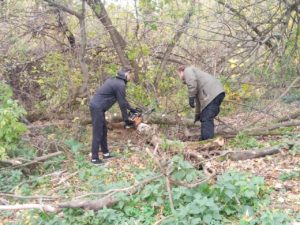 Всем участникам акции музей выдал мешки и перчатки, грабли и лопаты. А вот бензопила у музея одна, но волонтеры пришли поработать со своим инструментом.