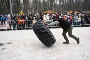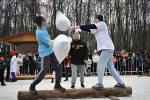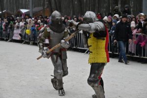 В центре событий на праздновании Масленицы были традиционные игры и состязания. Вначале зрителей «разогрели» поединки рыцарей, с мечами и в доспехах. Это были профессионалы в железных шлемах и кольчугах, участники клуба исторической реконструкции.