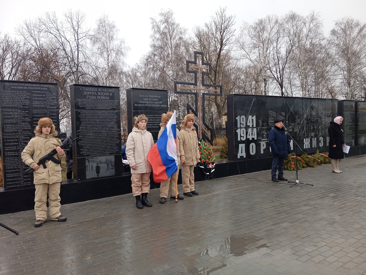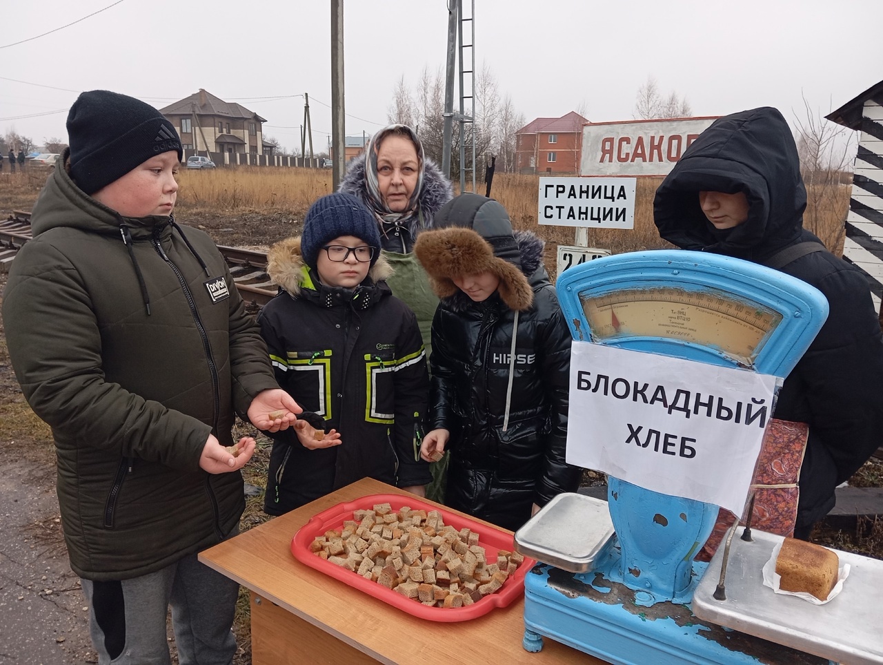 Все участники митинга приняли участие в акции «Блокадный хлеб». Его раздавали на реконструированном фрагменте железнодорожной станции Ясаково неподалеку от мемориала.