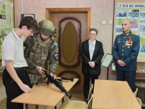 На урок к ребятам пришли курсанты РГВВДКУ имени генерала армии В.Ф.Маргелова. Они показали, как быстро и правильно разбирать и собирать автомат Калашникова, у самых активных школьников приняли зачёт и поблагодарили старшеклассников за хорошую военную подготовку. На память сделали коллективное фото и каждому подарили индивидуальный рацион питания (сухпаек).