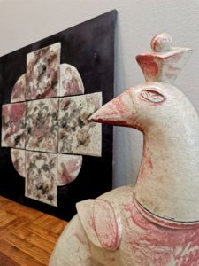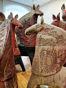 А крепкая основательная керамика Ирины Бабодей идеально дополняет развеселую компанию. Неземные сущности суровы и загадочны, заводные птицы полны скрытой силы. О конях и говорить нечего: они словно стерегут все стороны и углы, а в гривах их пляшут узоры вечности. На таких не уехать, но самое важное и интересное они несут сами.