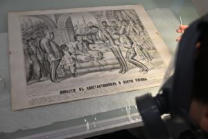 За соседним столом склонилась над старинной литографией «Известие в Константинополь о взятии Плевны» художник-реставратор по графике Евгения Детюк. Она ученица Риффель и тоже приобретала знания и навыки в Высшей школе народных искусств. Очень ответственная у нее задача, в работе приходится использовать токсичные материалы, поэтому Евгения надела маску-респиратор, предохраняющую дыхательные пути и глаза. Нелегко проводить часы напролет в защитном облачении, но какие только неудобства не вытерпишь ради искусства! Вид у молодой девушки – как у космонавта.