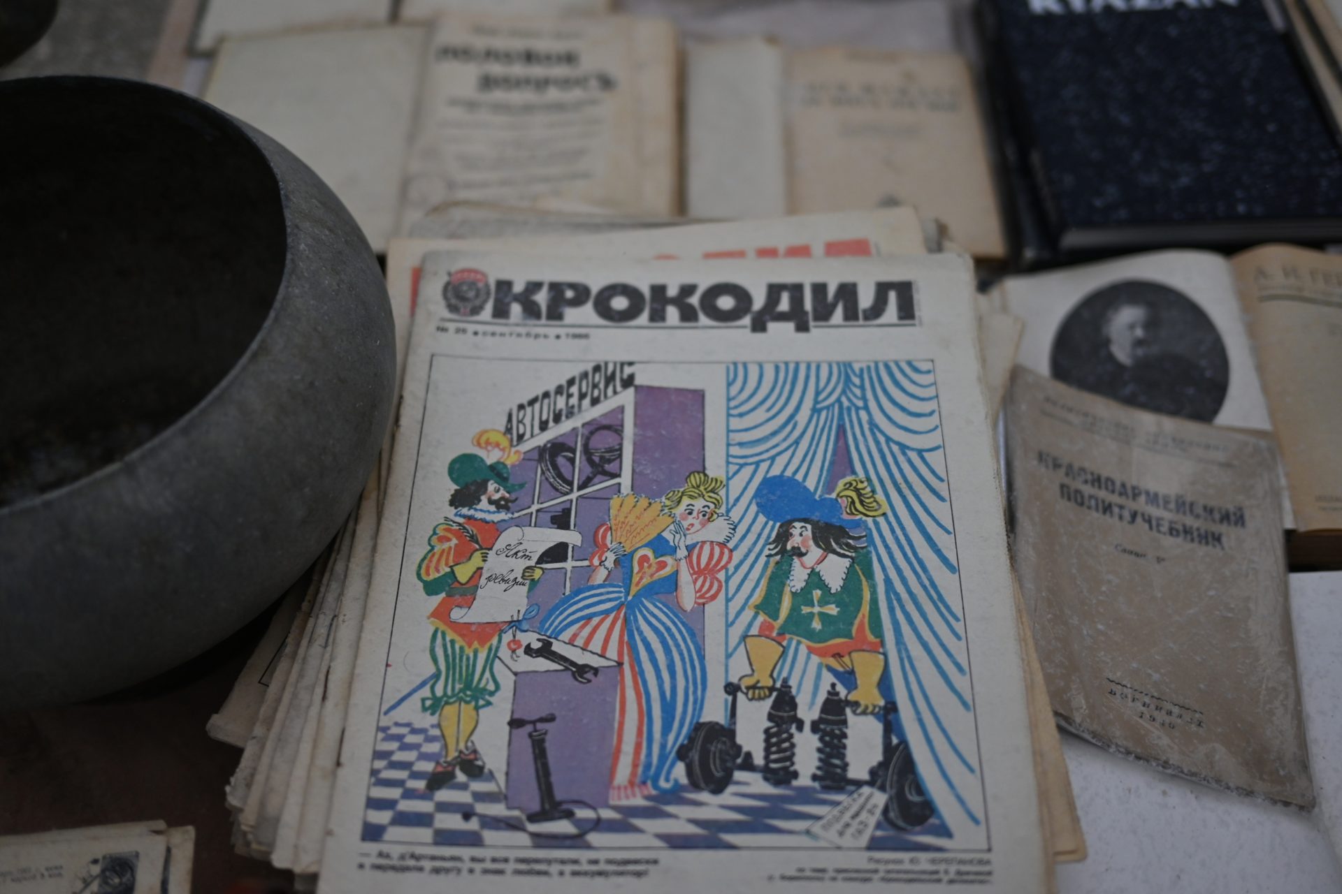 Коллекционеры в первый день работы ярмарки охотно покупали советские открытки с портретами звезд кино, приглядывались к значкам, маркам, фарфоровым статуэткам. Наверняка найдутся покупатели и на такие раритеты, как подшивка журнала «Крокодил» или «Красноармейский политучебник» 1940 года издания.