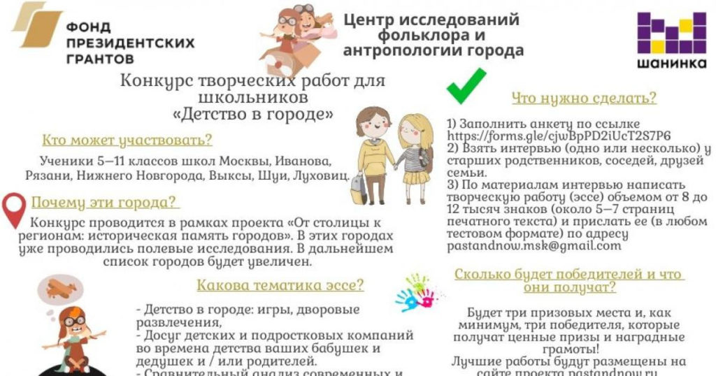 Для участия необходимо заполнить анкету по ссылке, взять интервью у старших родственников или друзей семьи, написать по его материалам эссе о городском детстве – дворовых играх, досуге, детских и подростковых компаниях во времена родителей или бабушек и дедушек.
