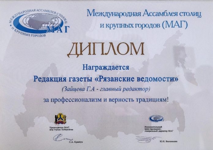 Газета «Рязанские ведомости» получила награду за победу в XIII Международном конкурсе «Город в зеркале СМИ»