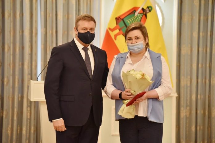 Николай Любимов вручил орден Мужества медицинской сестре отделения анестезиологии и реанимации областной клинической больницы имени Семашко Елене Федоровой.