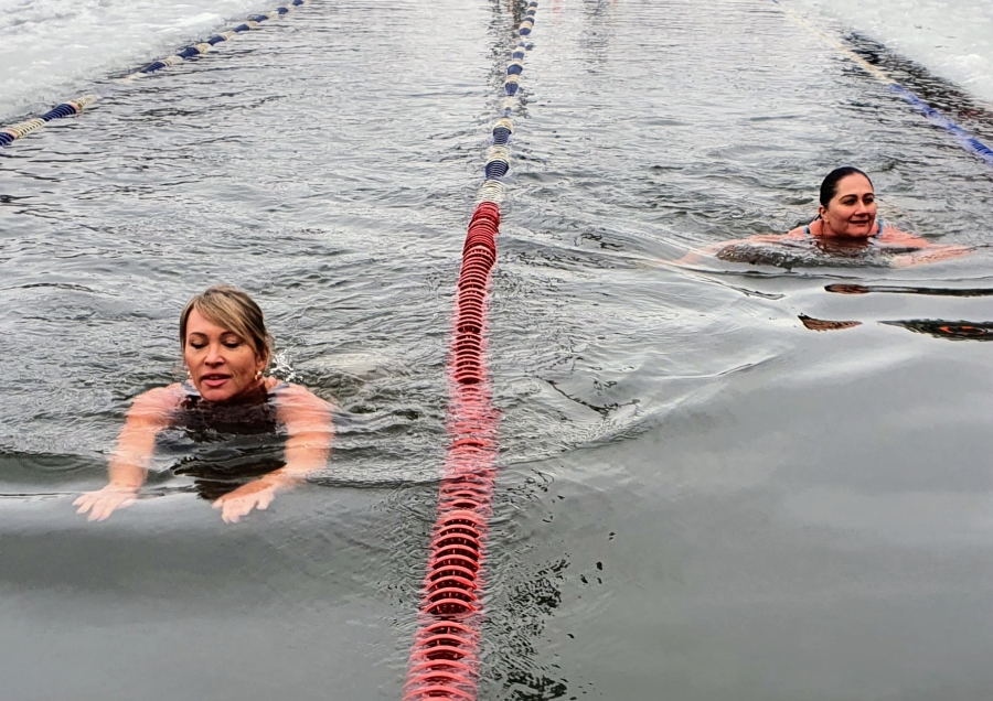 Ведущий фестиваля Дмитрий Беляев и председатель клуба зимнего плавания и закаливания «Эврика» Александр Яшин так завели публику, что в ледяную воду опустились даже те, кто вовсе и не собирался плавать. С новичками провели инструктаж, ознакомили их с возможными вариантами развития событий. У бортика на всякий случай поставили спасателей МЧС. Мастер-класс для новичков проводят Ольга Пронникова и Елена Бойцова.