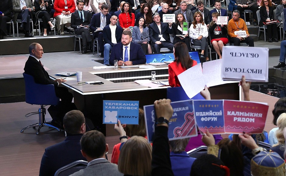 В этом году она прошла в объединенном с пресс-конференцией формате. Глава государства отвечал на вопросы журналистов и обычных граждан 4 часа 27 минут. По данным ТАСС, на прямую линию с Президентом с 8 по 19 декабря поступило почти 2,5 млн обращений.